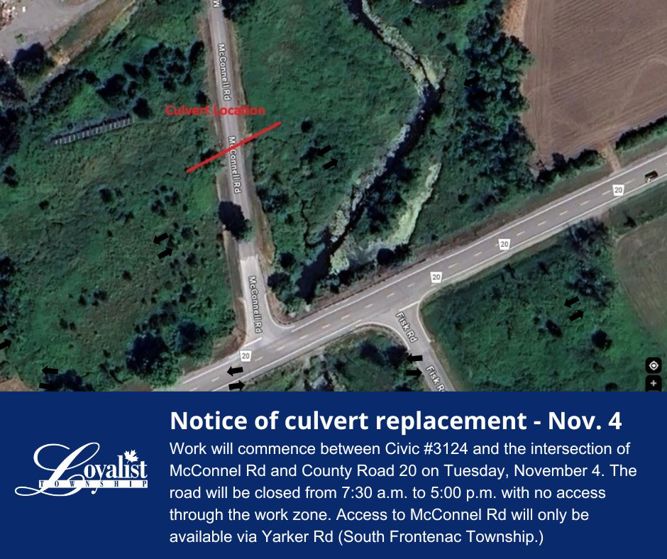 Loyalist Township Public Works will be replacing two cross culverts on Tuesday, November 4th. Work will take place between Civic #3124 and the intersection of McConnel Rd and County Road 20. Due to the location of the work zone and the limited road platform there will be a full closure in effect from 7:30 a.m. to 5:00 p.m. with no access through the work zone. Access to McConnel Rd will only be available via Yarker Rd (South Frontenac Township).